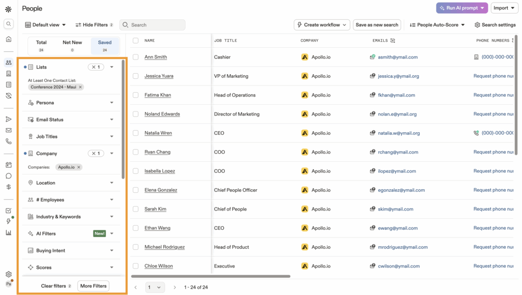 With Apollo, you can save your search and even set up email alerts when new contacts match your criteria.